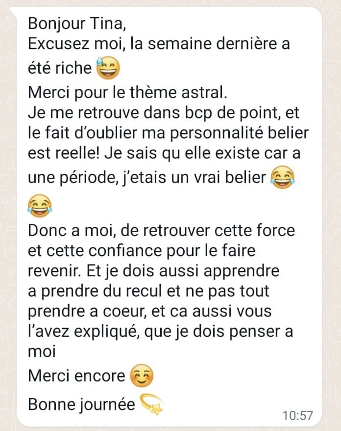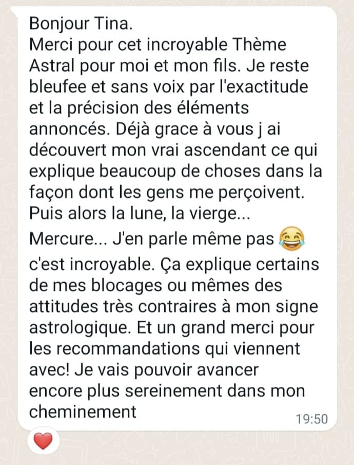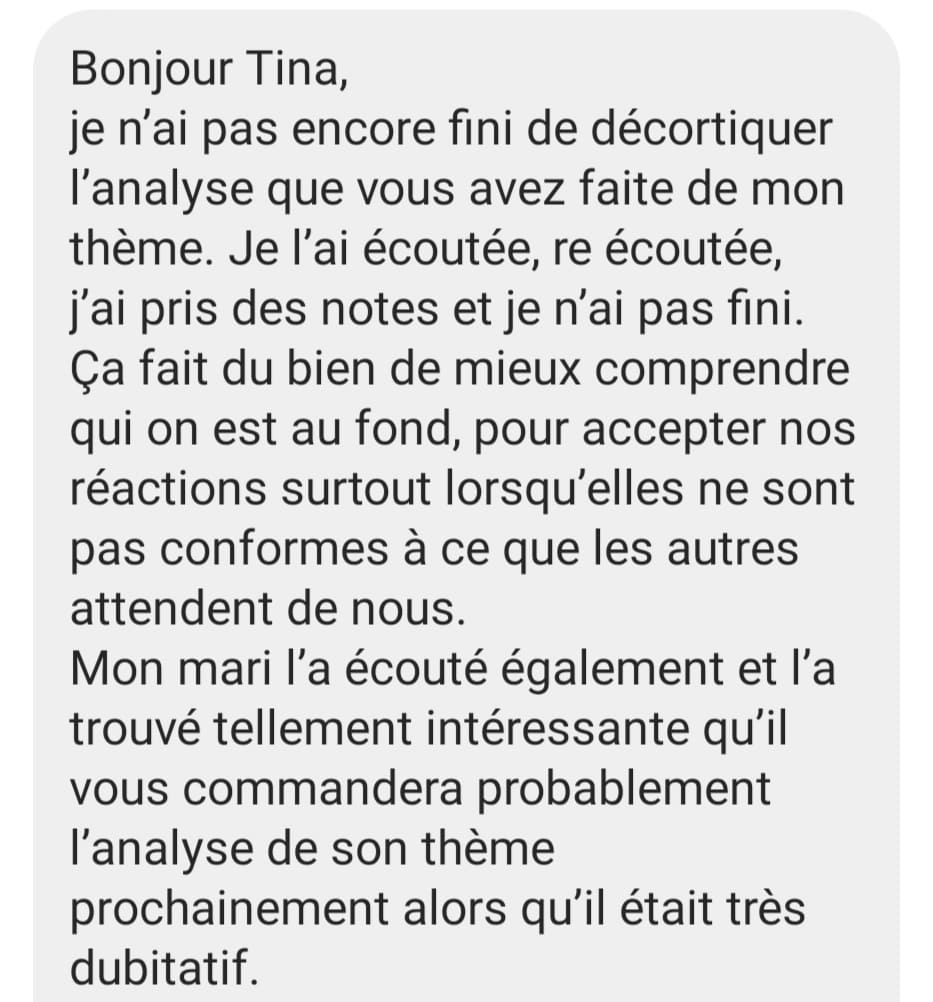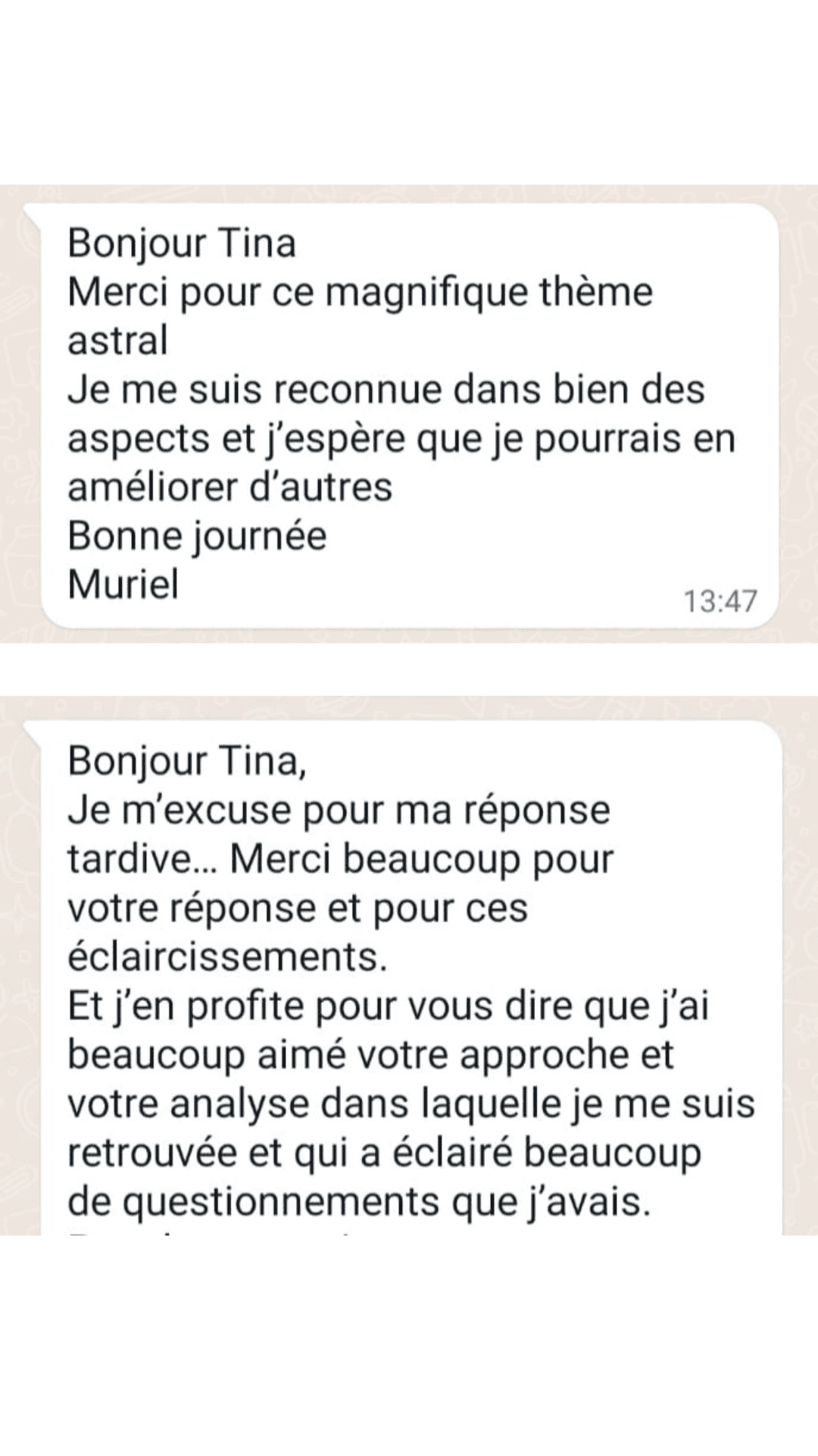 Une consultation personnalisée avec moi donne des réponses aux questions les plus importantes de votre vie. Chacun des éléments astrologiques a une signification et un rôle. Grâce à leur interprétation, vous allez pouvoir mieux cerner vos traits de caractère et certaines de vos actions, votre potentiel, vos talents et vos points de croissance, la première impression que vous donnez aux autres, vos relations avec des recommandations pour les améliorer, votre mission de vie, etc.